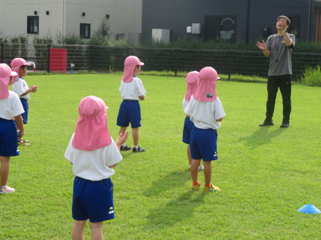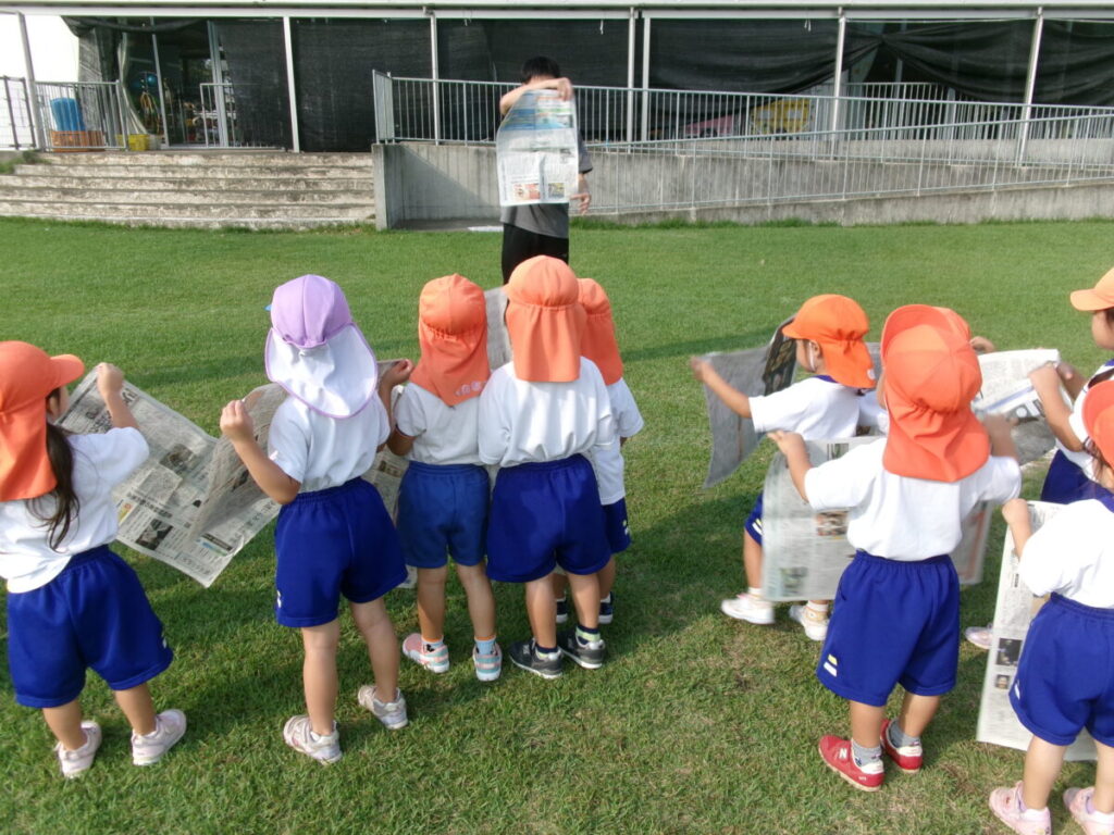 今日は体操教室がありました。今月のテーマが『投げる』だったのでボールを使って何かをすると思ったら先生が準備していたのは新聞紙!1人1枚取り、新聞紙をお腹にあて、手を離すと落ちますが走るとお腹にくっついて子どもたちも不思議と思いながらも面白がっていました。その後、その時間を丸くボールのようにして高く上げてキャッチしたり、遠くに飛ばす練習をしました。