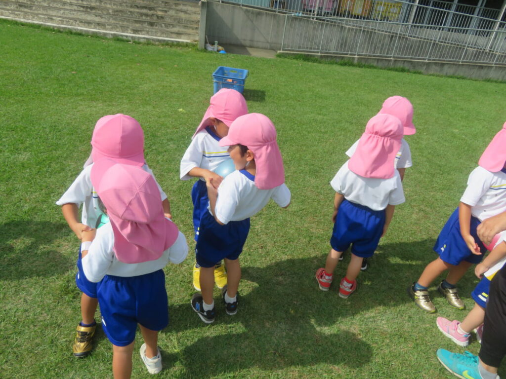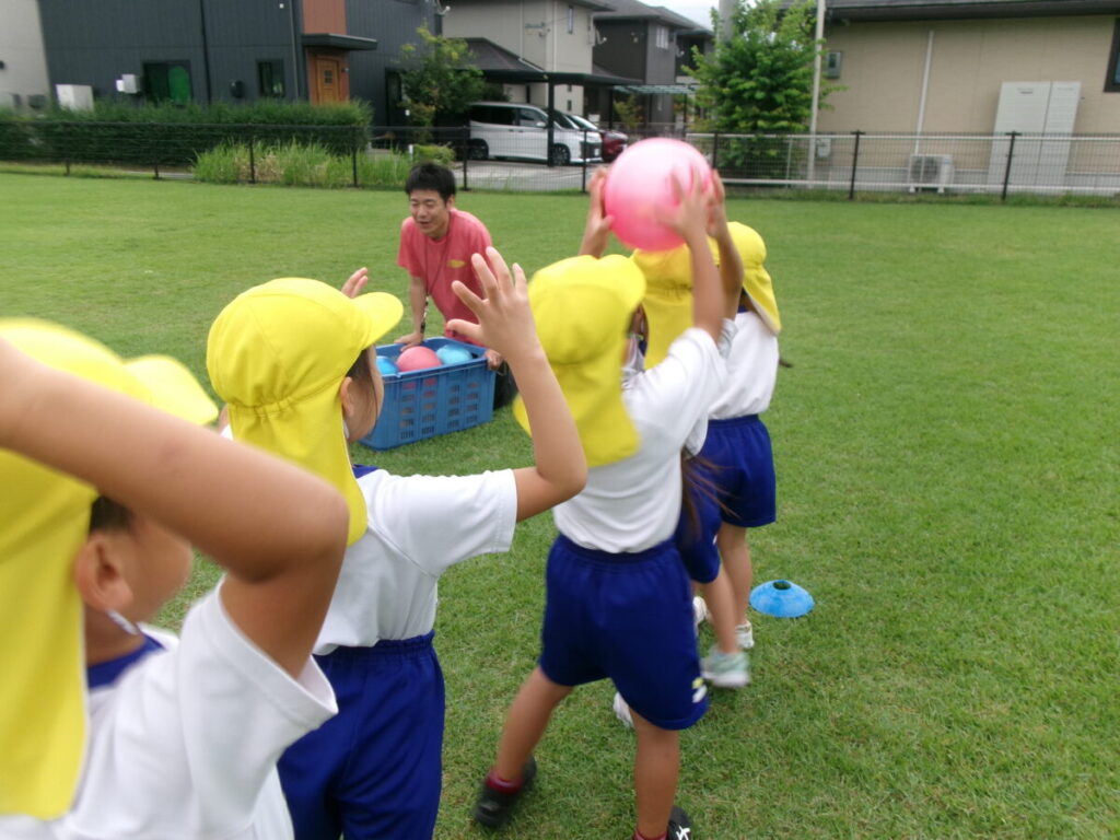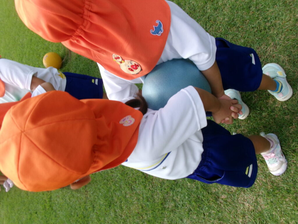 今日は体操教室でボールを使った活動を行いました。2人組になって背中合わせでボール運びをしたり、止まっているお友だちの周りをボールをはさんだまま落とさないよう回るなどしました。力加減が難しく、最初は何度も落としていましたが、少しずつ息も合い、コツをつかんで上手に回れるようになりました!その後はキャッチボールを両手や片手でやりました。去年よりも友だちへ向けて上手にコントロールして投げる事ができていましたよ。最後はチーム戦でボール運びゲームをしました。頭の上や足の間を「はい!」「とって!」など声を掛け合いながらチームワークばっちりの戦いでした!