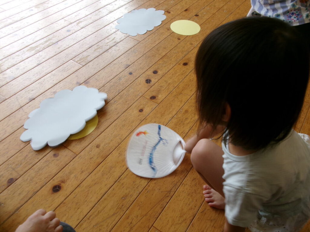 お月見ゲームもしました。うちわを使って雲をどかしお月様を出すゲームですが、みんなとても上手でした(^^♪勝ったグループにはうさぎのメダルのプレゼントがありました。