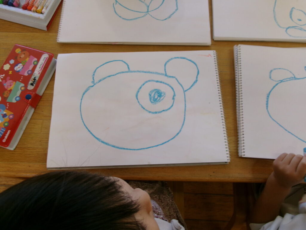 今日は絵描き歌に合わせて、ねこ・ぞう・きつね・カメラ・帽子を描いてみました。丸を描くのはとても上手になりました。四角や三角はそれなりに形になっていました。色々な形に興味を持っているようなので一緒に形に触れたり描いたりしながら覚えていきたいと思います。