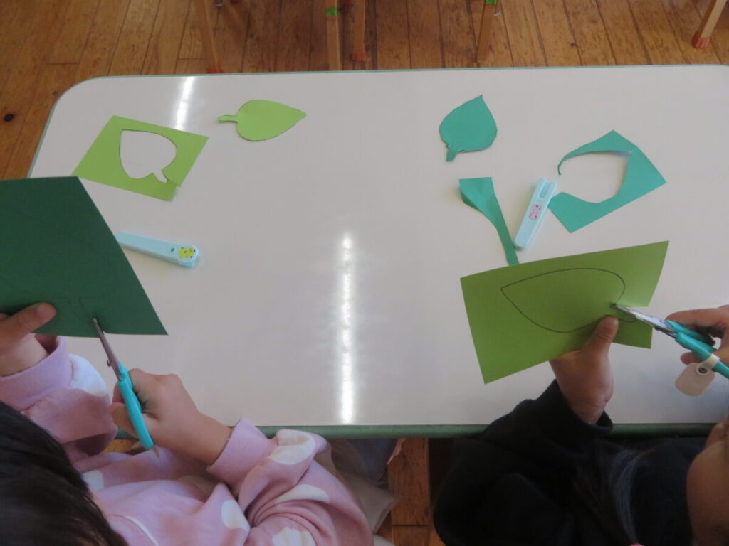 今日は通報訓練に参加した後、部屋に戻り発表会の劇で使う木の葉を子どもたちに切ってもらいました。保育士が型を描いた画用紙を配るとあっという間に切り終わるので用意した枚数全て子どもたちが上手に切ってくれました。次回は切った葉を木に貼りたいと思います。