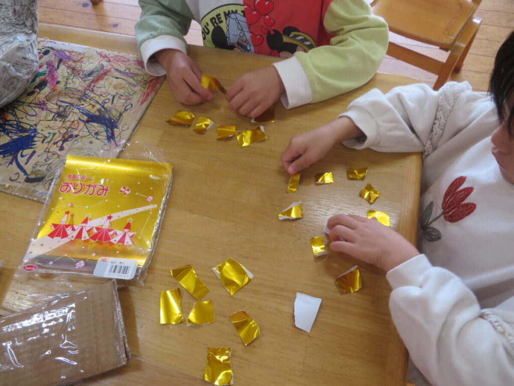 今日は劇で使う金のがちょう作りをしました。新聞紙でがちょうの形を作ったものに1人1枚金色の折り紙を配り小さくちぎってボンドで貼っていきました。がちょうが金色になっていくと「金のがちょうになってきた!!」といって喜んでいました。その後劇の練習をしています。昨日よりも声を出そうとする子どもたちが多く見られました。