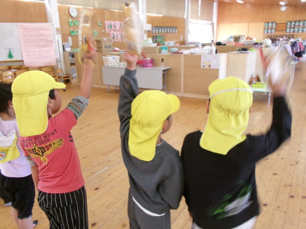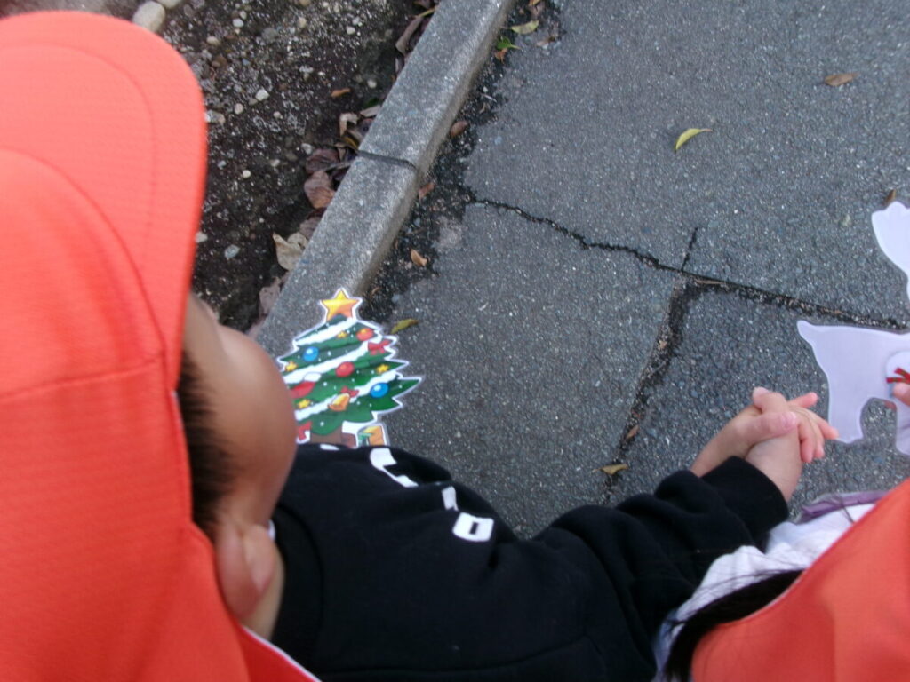 マラソン練習が終わり部屋に入るとパンツ1枚のおじいさんが!!そこで保育園にくるまでに落とした洋服や迷子になった仲間たちをみんなで探しに行きました。いろんな落とし物を見つけると「あった!あった!」と見つける子どもたち!!見つけた洋服や仲間をおじいさんに・・でも長靴が片方しかないのでもう1度探しに行き見つけることが出来ました(^^♪洋服をきていくとおじいさんはサンタさん☆クリスマスにはプレゼント持って来るよと約束してくれました(^^♪