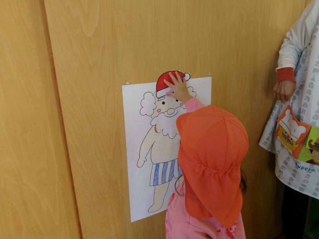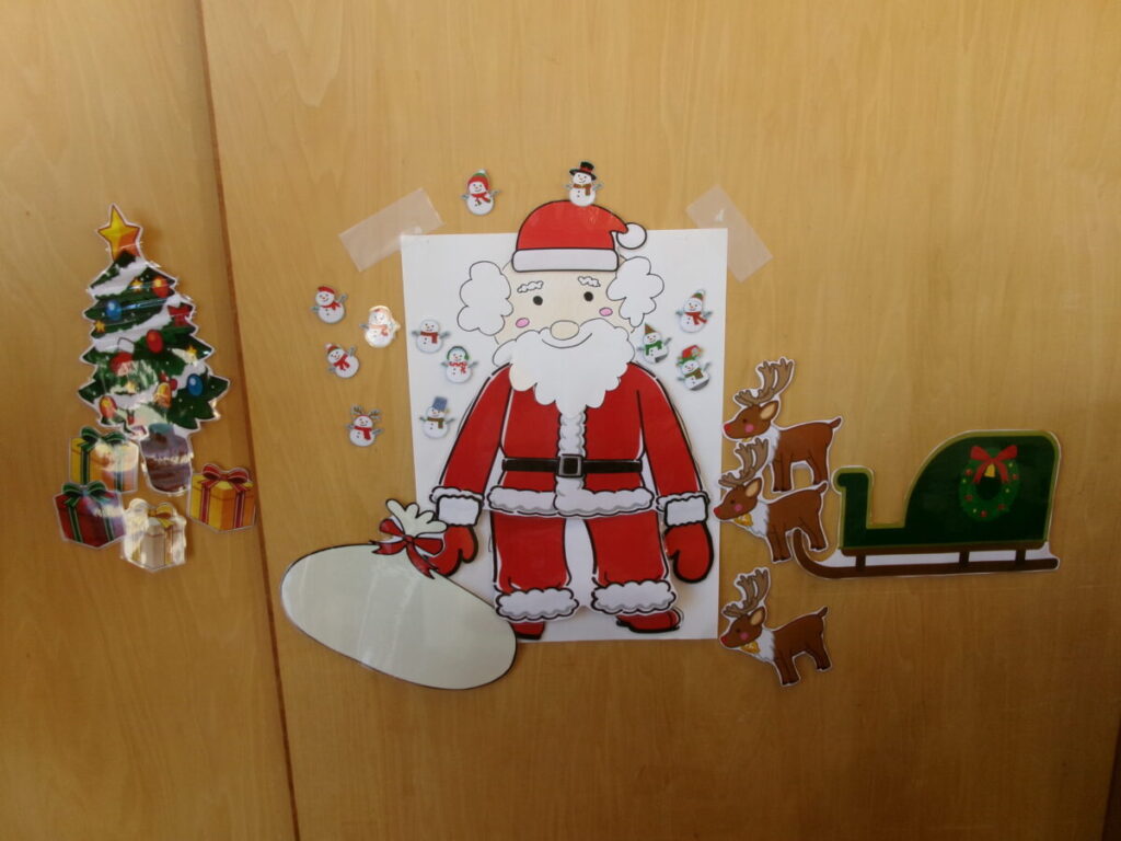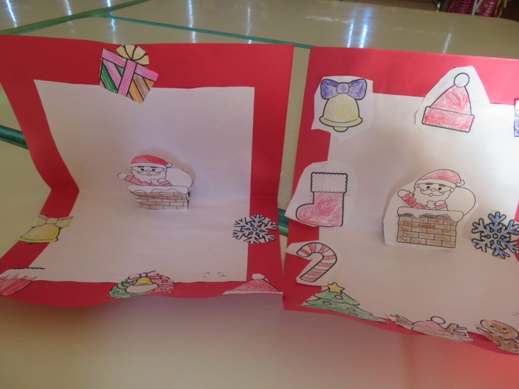 今日は先週の続きでクリスマスカードを作りました。色を塗り終えたイラストをハサミで切り、カードの真ん中にサンタクロースを貼り、残りは周りや表紙に貼りました。カードを開くとサンタクロースがとび出すので子どもたちは「かわいい」と喜んでいました(^^♪完成したカードにサンタさんからもらいたいプレゼントを書きたいと思います。どんなプレゼントが子どもたちは欲しいのか楽しみです!!