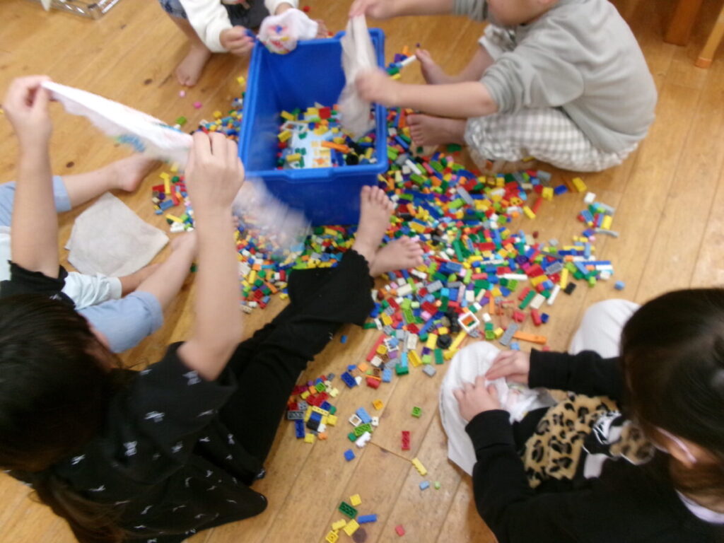 今日は大掃除という事で、くじら組はクリスマスツリーの片付けとお部屋の玩具の掃除をしました。ツリーを片付けながらサンタさんにもらったプレゼントの話で盛り上がっていましたよ。玩具の掃除では特に小さくて量の多いレゴブロックやカプラを1つ1つ丁寧に拭き上げるのが大変でしたが、それぞれチームに分かれて「1つずつやろう」「終わったらきれいに並べて入れよう」など互いに声を掛け合いながら進めていました。終わってピカピカの玩具を棚に並べると気持ち良くて「なんか嬉しいね!」と話す子どもたちでした!