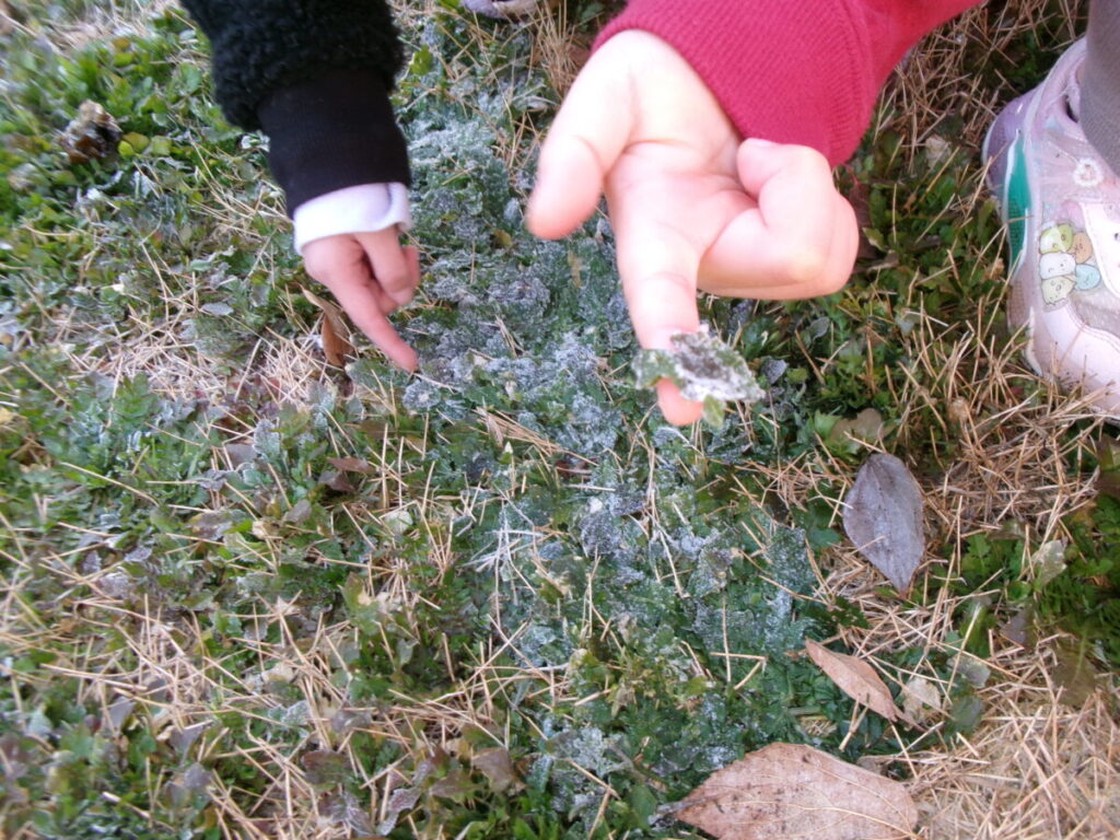 今日は天気が良かったので芝生で戸外遊びを楽しんでいます!早朝は霜が降りて冷えた朝となり、今年初のマラソン練習も「いやだー」と言っていた子どもたち。ですが走り始めると体もポカポカしてそのまま上着無しで戸外遊びを楽しんでいましたよ。日陰部分はまだ霜が残っている事に気づいたのですが「触ると溶けちゃうからそっと見るだけにしよう」と話して日なたの草花を集めてお料理をしていました。包丁やまな板代わりに石を拾い、切って楽しんでいました。