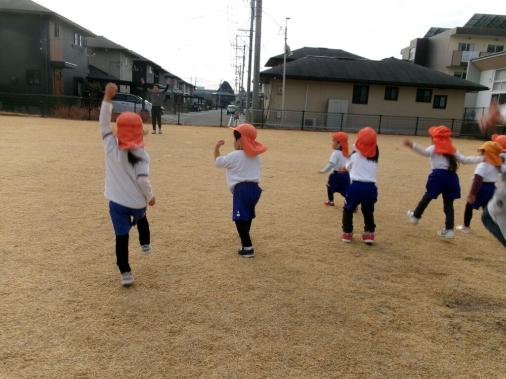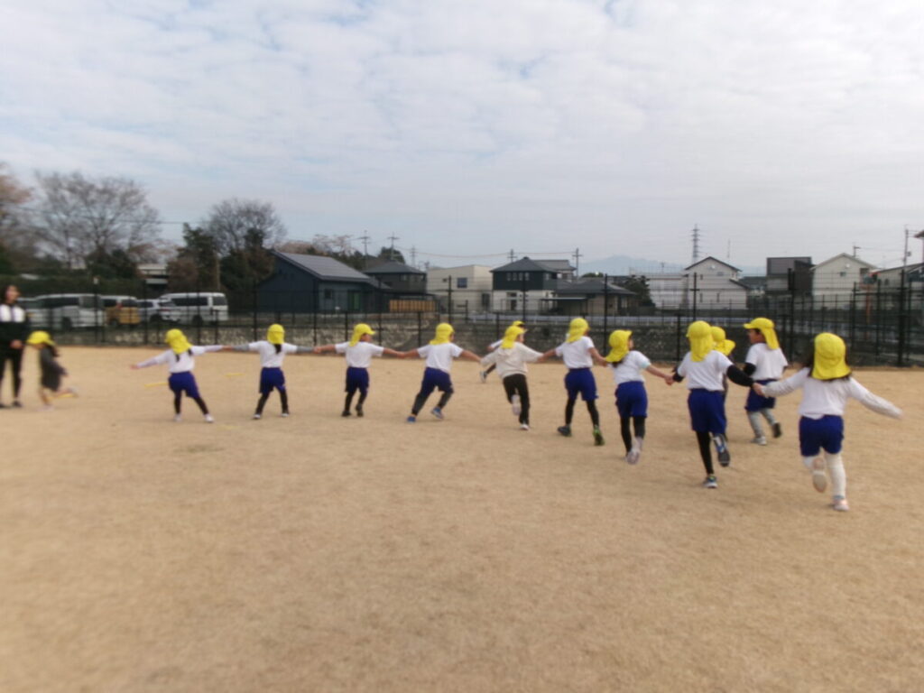 今日は体操教室がありました。まず芝生園庭を走ったり、スキップやマーカーを使ったウオーミングアップをした後、手つなぎ鬼ごっこをしました。初めてするゲームだったのでタッチをされないように必死に逃げ回る子どもたち。少しずつ手をつないでいるお友だちが増え始め最高で10人の手をつないだ鬼ができあがっていました。しかし、追いかける事に夢中になり手を離して追いかける子どもたちもいたので普段の保育でも手つなぎ鬼をしてルールをもう1度確認して楽しみたいと思います♪