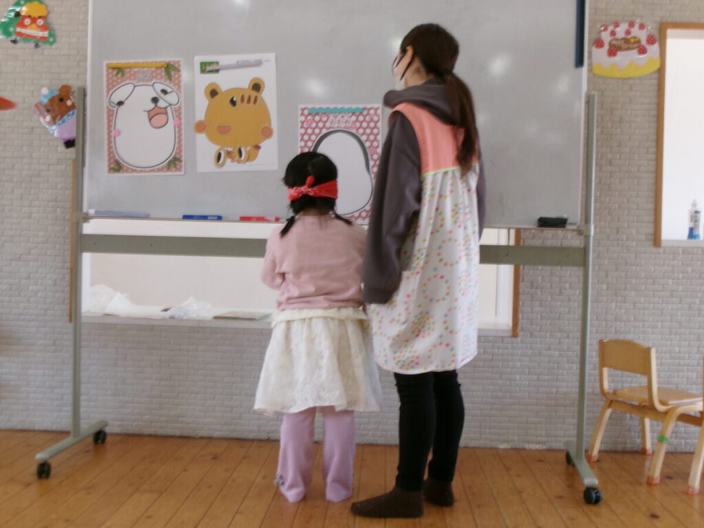 今日は1月生まれの誕生会がありました。残念ながら体調不良のため2名のお友だちが欠席でした。3名のお誕生児さんはインタビューや質問に嬉しそうに答えていましたよ。その後、1月という事で誕生児さんによる福笑いをしました。みんなとてもおもしろい顔になりまわりのみんなもたくさん笑っていました(^^♪後から他のお友だちも遊んでみました。たくさん笑って寒い冬を乗り越えたいと思います!