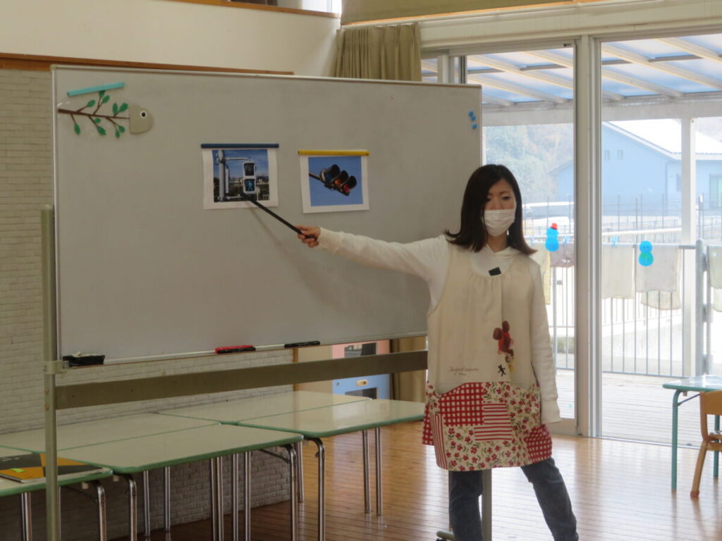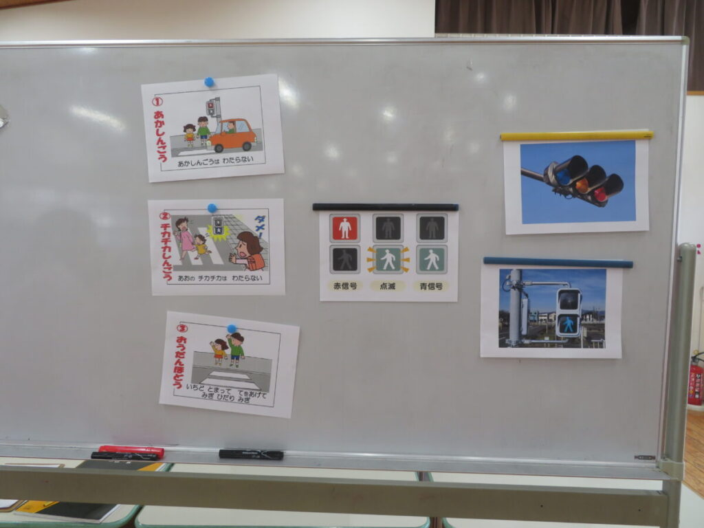今日は交通安全指導があり信号機の意味や横断歩道の渡り方についての話がありました。最初に2種類の信号機を見せると「車用と歩行者用の信号」と言ってすぐに答えることができました。次に赤・黄(点滅)・青信号の意味や横断歩道を渡る時の約束などを子どもたちと一緒に確認をしました。どの内容もしっかり理解できていたので、お散歩へ行く時やお家の方と出かける際は思い出し、交通ルールを守って欲しいと思います。