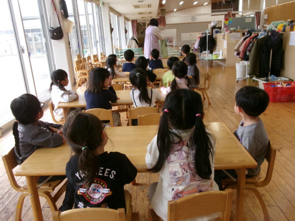その後、パタカラ体操が初めてありました。大塚先生に舌の動かし方を教えてもらいました。か→たになる子が数人います。正しい発音が遊びながら身に着くといいなあと思います。