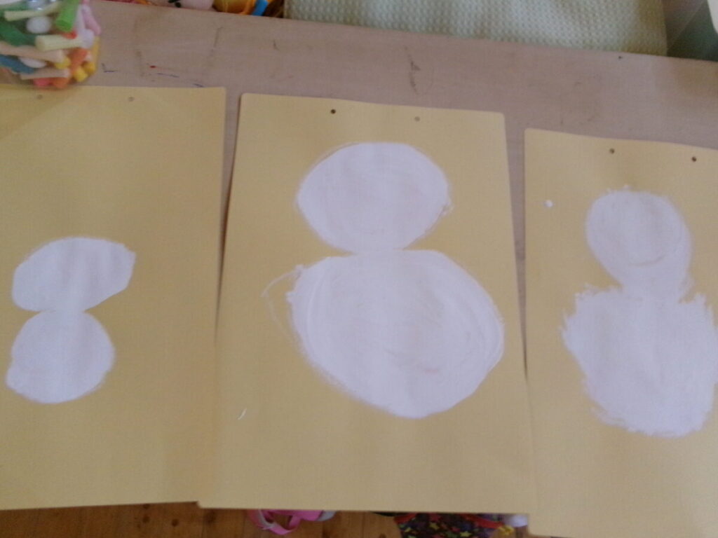 2月の製作で雪だるまをクレヨンと絵の具を使って描いていきました。まずはクレヨンで小さな丸と大きな丸を描いた後絵の具で塗って完成!個性的な雪だるまができました(^^♪