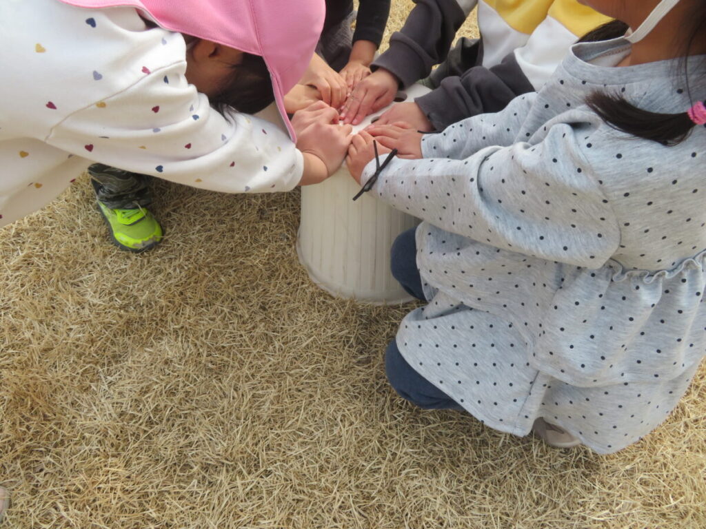 今日は芝生園庭で『色おに』をして遊びました。バケツ型のカラーコーンを置き芝生園庭にある色を増やし「いろいろ なんの色」と子どもたちが聞くと鬼さんになったお友だちは話し合って決めた色を「あか」や「しろ」と言って追いかけました。鬼以外の子どもたちは周りを見渡し一斉にダッシュ!!「○○くんこっちだよ」「○○ちゃんがんばれ」と声を掛け合う姿が見られたり、鬼は話し合い作戦を考えたりしていました。たくさん体を動かしながら友だちとのやりとりを楽しめた1日でした。