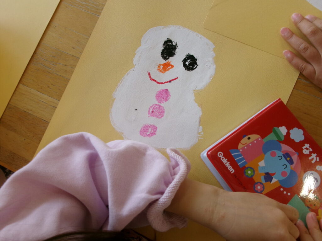 今日は製作をしました。前回絵の具で雪だるまを描いていたので今日はクレヨンで顔やボタンを描きました。その後は雪だるまにつける帽子をハサミで切ってノリで貼り付け、雪を雪だるまの周りに貼っていきました。雪だるまの手を自分たちの手形にしました。絵の具を手に付けてスタンプしたので感触を楽しんでいました。