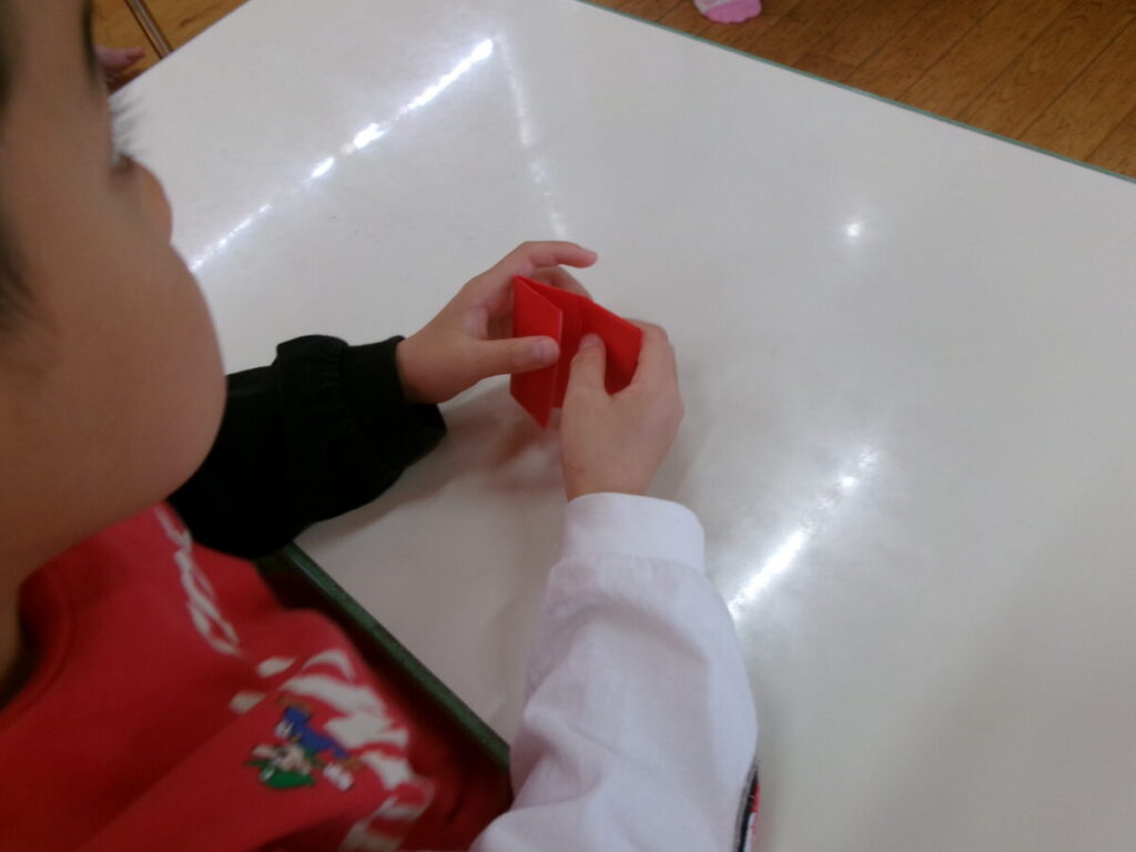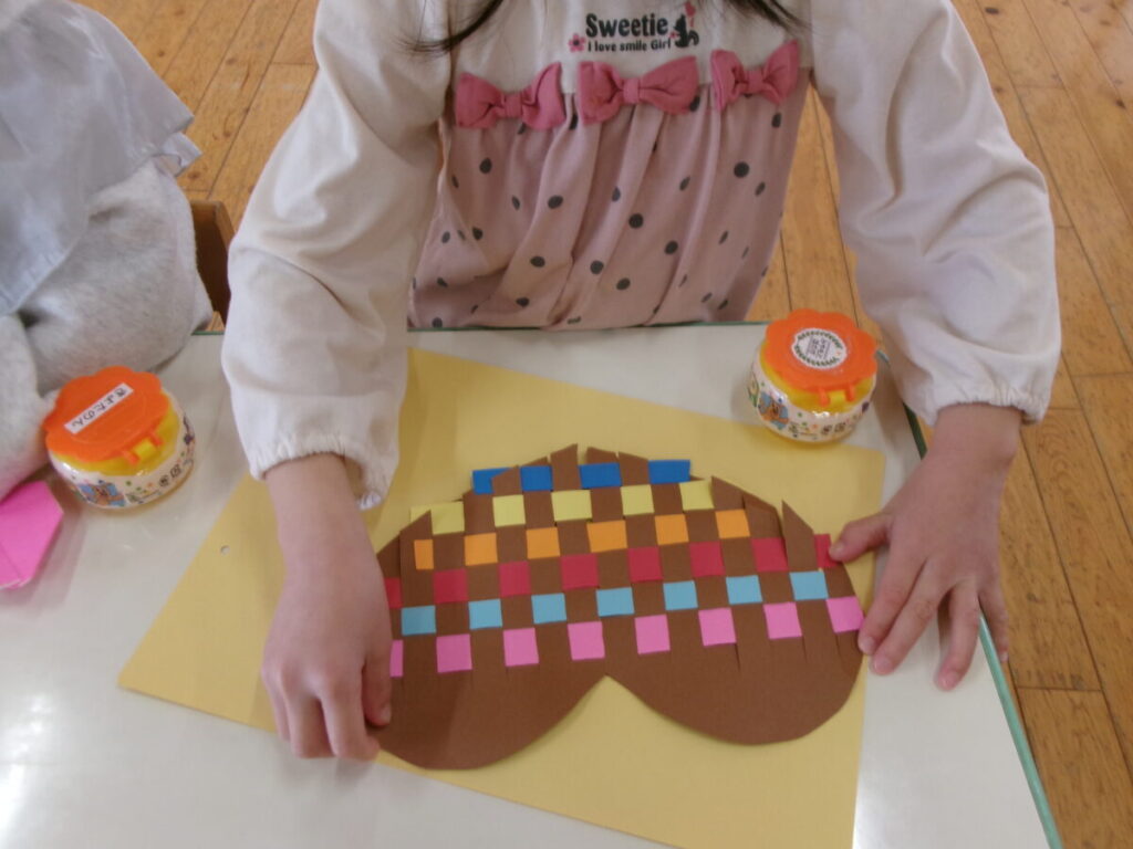 今日は2月の製作の仕上げをしました。折り紙でハートを作り、前回の画用紙で編んだハートと一緒に貼り付けています。もっとハートがたくさん欲しい子は小さな折り紙を切って飾りのハートを作りました。ハートいっぱいで、どれも可愛い出来上がりになりましたよ!