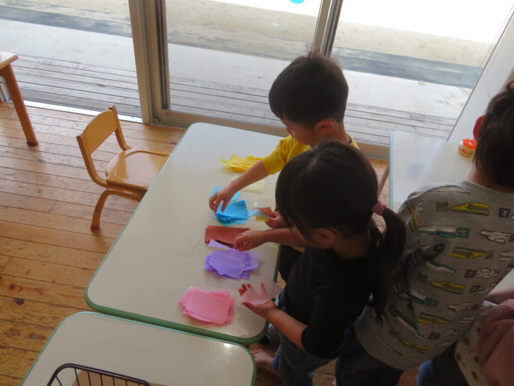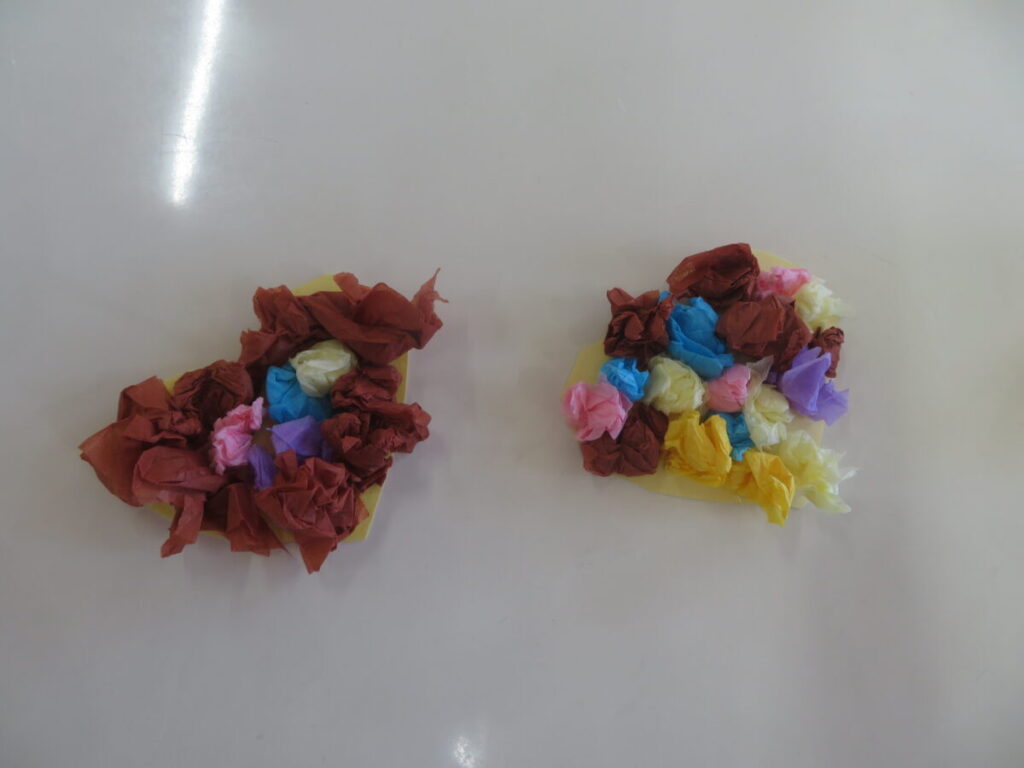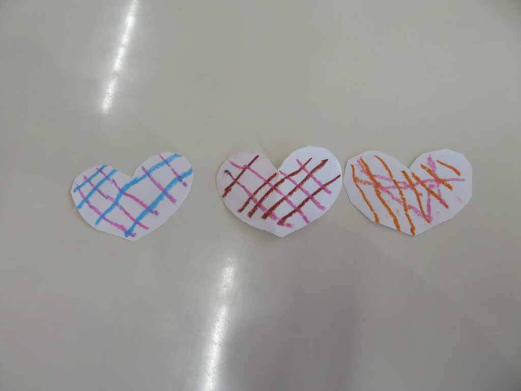 今日はバレンタイン製作をしました。まずハサミを使ってハートの形に紙を切りました。1枚はクレヨンで模様を描き、もう1枚は花紙を丸めてのりで貼り付けました。クレヨンではチェック柄の模様に挑戦しました。縦横同じ間隔にまっすぐな線を引くのが中々難しかったようです。花紙は好きな色を選び、小さく丸めて1つ1つ丁寧に貼り付けていました。心のこもった可愛いハートが出来上がりましたよ(^^♪