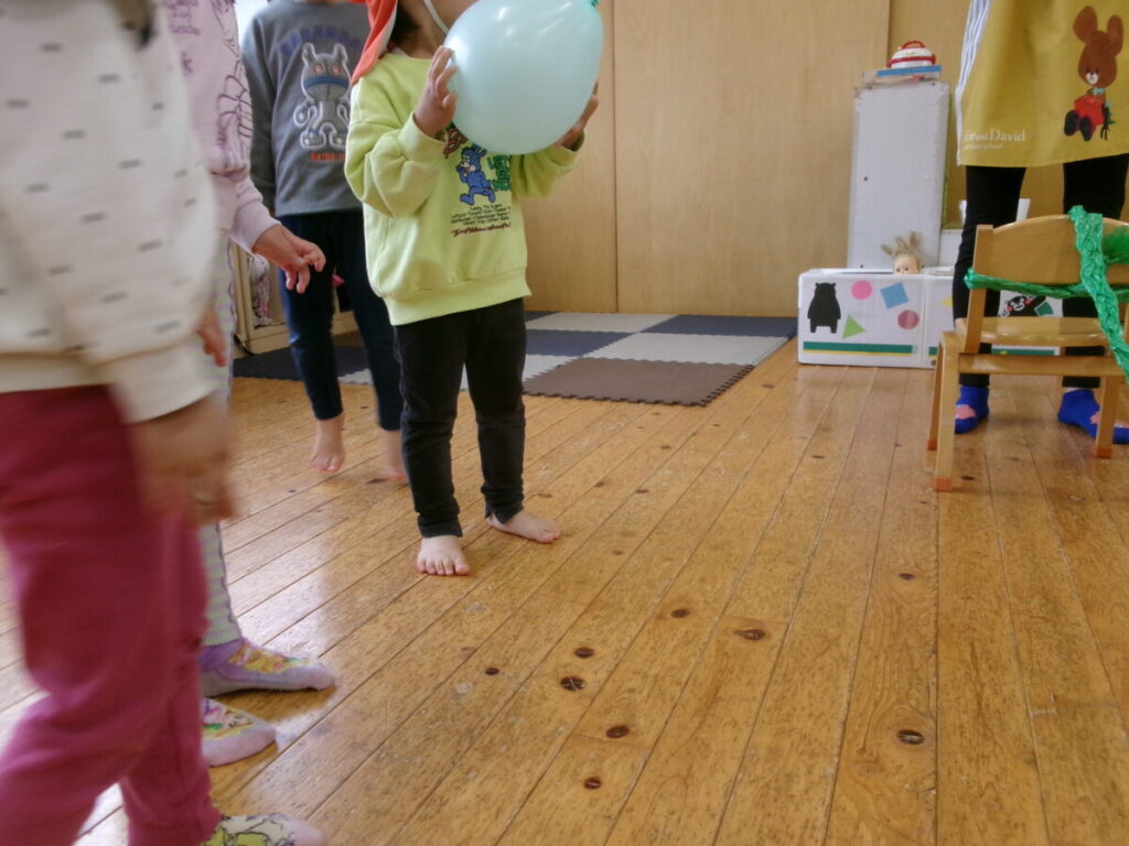 今日は絵描き歌をしました。ひつじ、ひまわり、犬、コックさん、お花を描きました。見本を見ながら一生懸命でしたよ。絵描き歌の後は風船バレーをしました。風船をたたいて相手のチームに入れなければならないのですが、風船をキャッチしてしまってまだまだ練習が必要なようでした。またやりたいと思います。