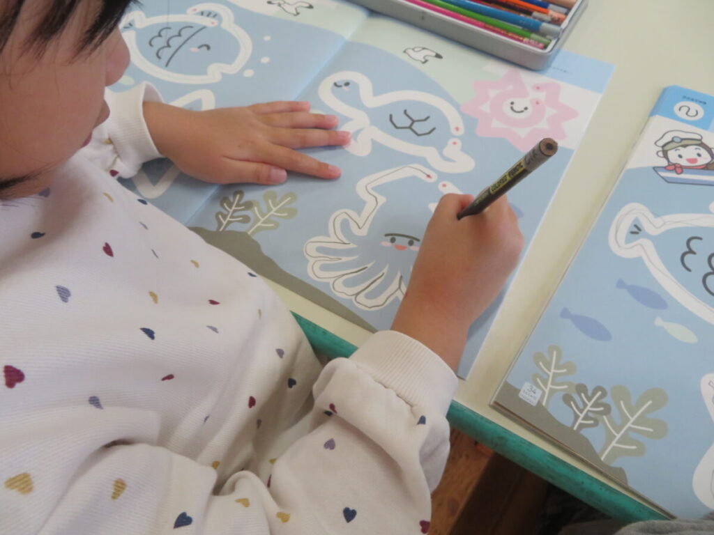 今日はワークをしました。1ページ目の内容はいろんな魚の形の線を”ひとふで”でかこうでした。子どもたちにひとふでの意味を聞くと「わからない」の声がほとんどだったのでホワイトボードを使って説明をすると「分かった!」と言って”ひとふで”でゆっくり書き始めました。2ページ目は〇△□などの形を点線からはみださないようになぞりました。実際に良い例と悪い例を子どもたちに見せて書いてもらったので「先生見て!上手にかけたよ」と言って見せてくれました。2ページとも最後まで集中して取り組むことが出来ました。