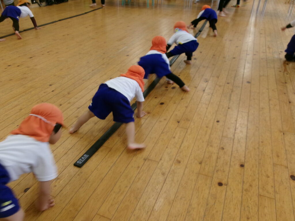 今日の体操教室は室内でありました。黒いゴム板を線に見立て、パージャンプ、ジグザグジャンプ、チョキジャンプ、ハイハイなどたくさんの動きをした後は、3人1グループになって風船を落とさずゴールまで行ったり、やさしく蹴って運ぶゲームをしました。とても楽しんでいましたよ。