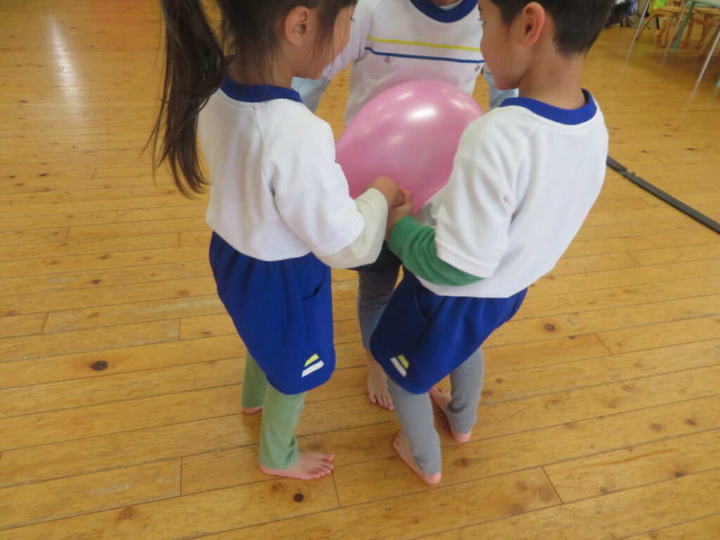 ]今日は外が雨の為お部屋で体操教室がありました。細いマットの上を落ちないように渡ったり、ジャンプしたり足を交互に動かして進んだりといろんな動きを取り入れて体を動かして楽しみました。その後3人グループを作って風船を落とさないようにお腹にはさんだり背中や頭でもはさんで進みました。風船がうまくはさまらず進んでいくうちにどこかへ飛んでいってしまうグループもありましたが笑い合いながら楽しんでいました。