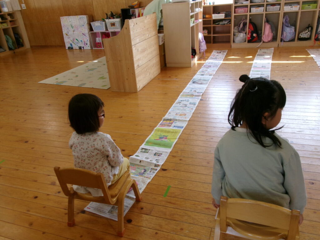 今日は新聞紙たぐりよせゲームをしました。一人一人のタイムを計り同じ早さの人で競いあいました。1位には双眼鏡のプレゼント。いす取りゲームもして楽しく過ごしました。その後は外でたくさん遊び給食はカーポート下で食べました!ツナおにぎりが人気でしたよ。