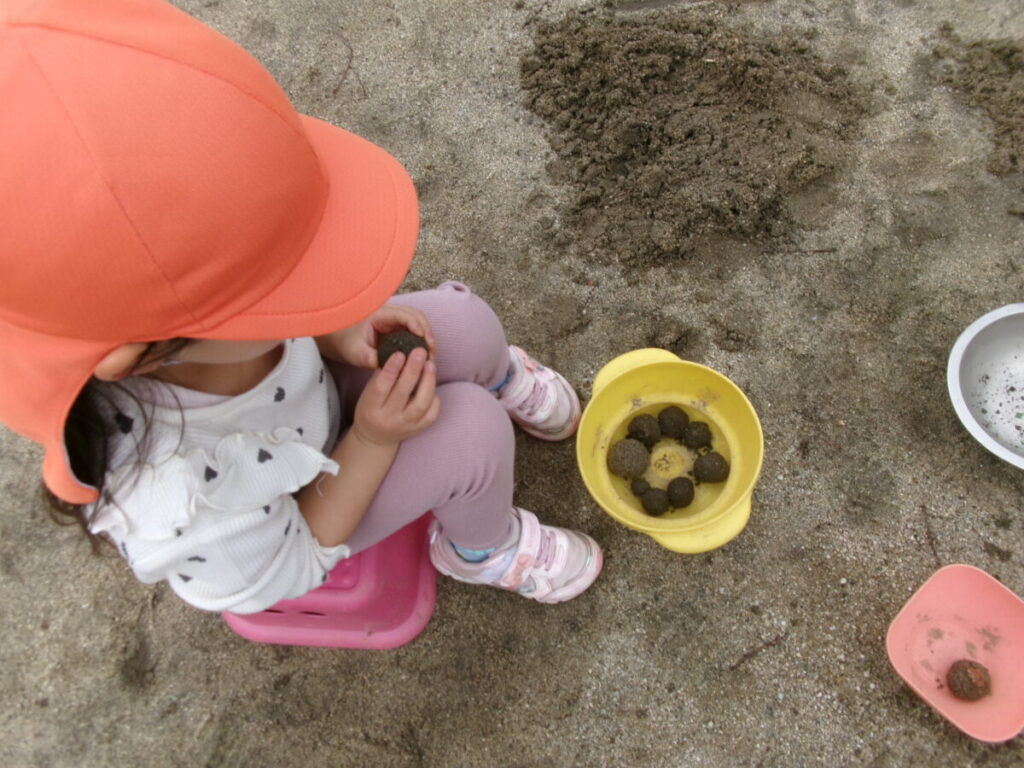 今日は外でたくさん遊びました。泥団子を作ったりケイドロやつなひきをしました。泥団子の腕が上達しています!